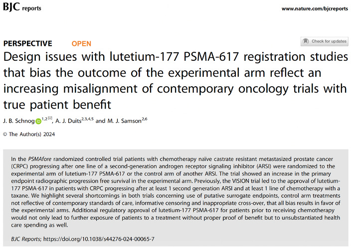 Recently, results of the Novartis sponsored PSMAfore RCT have been presented, where mCRPC chemotherapy-naïve patients, after progressing on an ARSI, were randomized either Lutetium-177 PSMA-617 or another ARSI. An improvement in radiographic progression-free survival (the time until there is progression on an imaging study) was demonstrated. This RCT, just as the VISION RCT, suffers serious limitations as we have highlighted here.