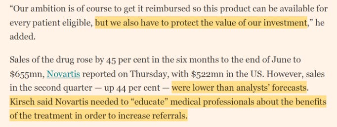 Here is a troubling statement found in the article. Sales in the second quarter of this year are lower than forecast. Therefore, "‘Novartis needed to “educate” medical professionals about the benefits of the treatment in order to increase referrals’, (i.e. ‘protect the value of the investment’).